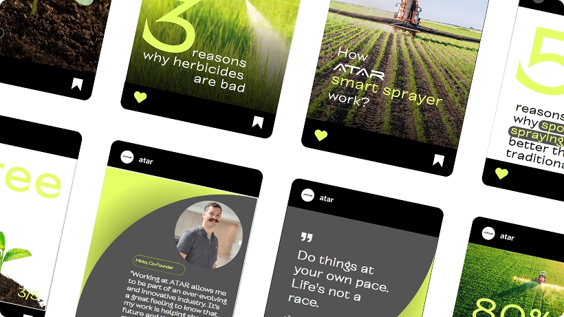 Created a bold and witty logo that instantly communicates ATAR’s focus in ag tech. Designed a comprehensive brand book with guidelines to ensure consistent visual identity, and built a cohesive social media presence across Instagram and LinkedIn that makes complex technology accessible and engaging
